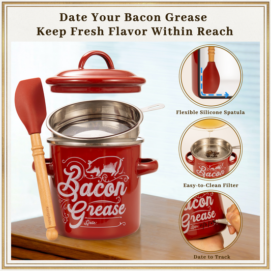 Bacon Grease Container with Strainer - With Food-Grade Silicone Spatula, 24oz Enamel Rustic Farmhouse Fat Container, Keeper, Recipes, Dishwasher Safe